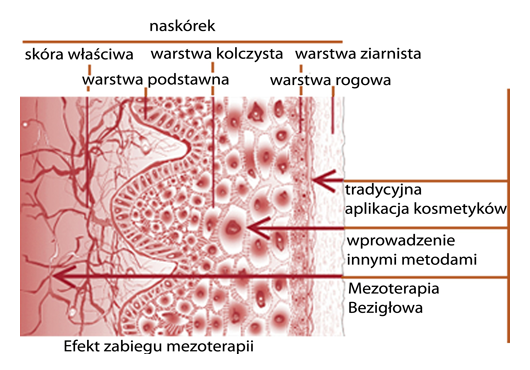 Szybko, bezinwazyjnie i bezboleśnie spłycenie zmarszczek i odmłodzenie skóry. Mezoterapia bezigłowa to wysoce skuteczna, bezpieczna terapia nie pozostawiająca ran na skórze. Zabiegi mezoterapii opierające się na zastosowaniu elektroporcji i elektroosmozy do odżywiania głęboko położonych komórek, drenażu limfatycznego, przyspieszania metabolizmu, poprawy przepływu limfy i krążenia krwi, a także niwelowania zmarszczek, rozjaśniania skóry, utrzymywania odpowiedniego jej nawilżenia, redukcji cellulitu, przyspieszania spalania tłuszczu i wyszczuplania całkowicie wyparły tradycyjne terapie z zastosowaniem mikroigieł. W porównaniu z zastosowaniem indywidualnych produktów do pielęgnacji skóry, mezoterapia pozwala osiągnąć większą skuteczność w zakresie wchłaniania produktów pielęgnacyjnych, eliminując problemy związane z nieprzenikaniem głębiej niż warstwa naskórka, a także skracając czas trwania terapii.